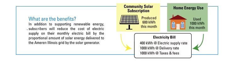 When you join the Reservation List and a community solar project becomes available to accept new subscribers, you will be notified with an opportunity to enroll. After successfully completing the enrollment process, you will receive the community solar credits on your monthly Ameren or ComEd electric utility bill for your share of the generation created by your Community Solar project. The invoice examples below show you how this works.