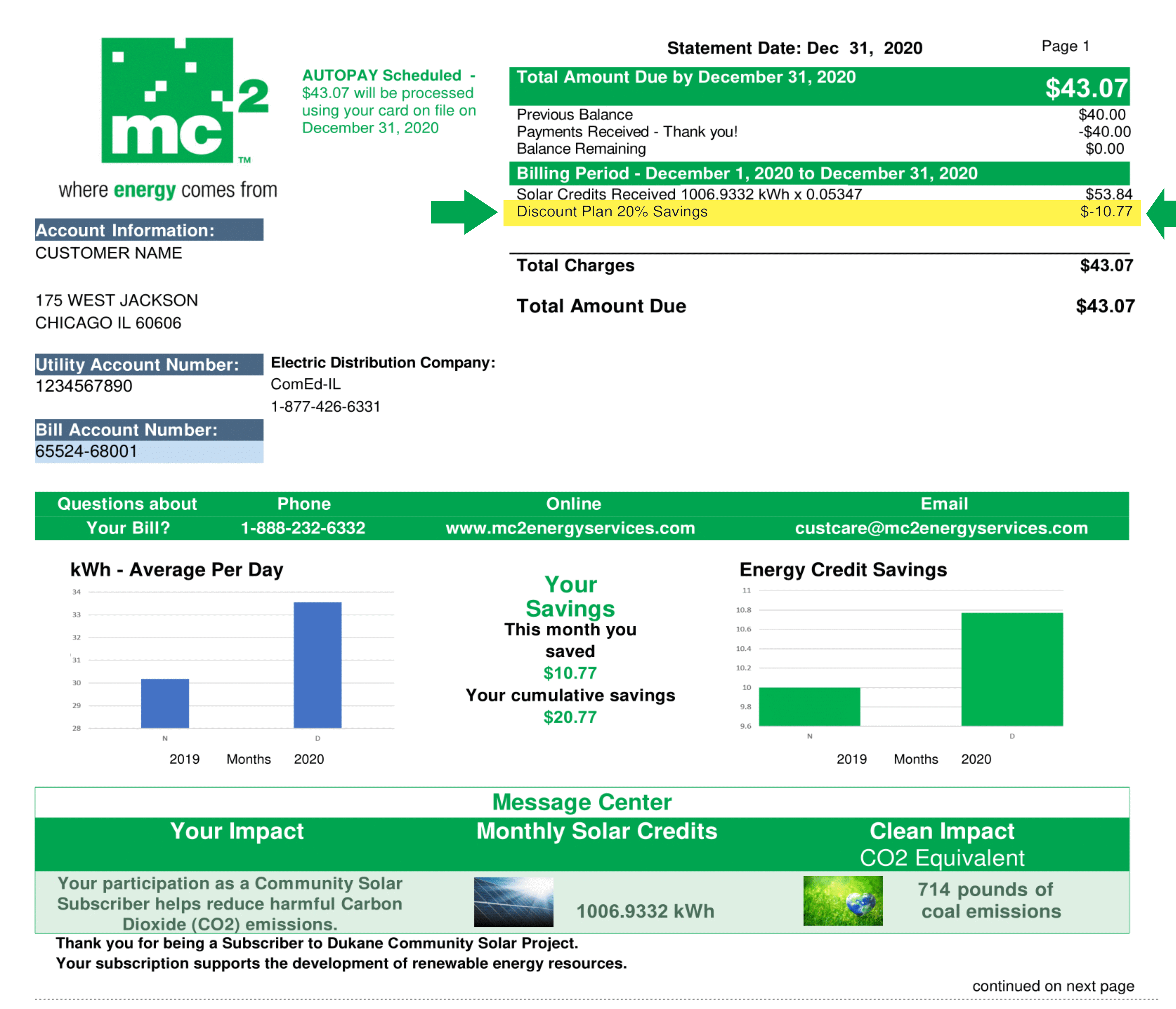 The community solar credits, based on your subscription, will appear on your monthly utility bill and will be credited against your total electricity utility costs. MC Squared Energy Services, LLC. (mc²) then bills you for 90% of the community solar credits to your credit card and you Save 10%. mc² even shows you how your participation impacts the environment each month.
